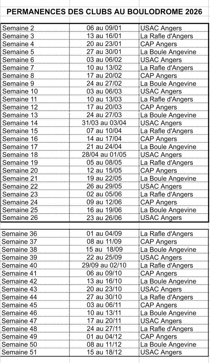 Le boulodrome couvert situé dans le Parc des sports de la Baumette, promenade de la Baumette à Angersest ouvert toutes les semaines de début septembre à fin juin sous l'autorité de l'Entente des clubs d'Angers. Les clubs du CAP Jules Ferry, de la Boule Angevine, de la Rafle d'Angers et de l'USAC tiennent à tour de rôle, les permanences et avec une obligation d'ouverture de 4 jours par semaine de 15h00 à 20h00. Le week-end est réservé aux éventuelles compétitions et réservations du site.